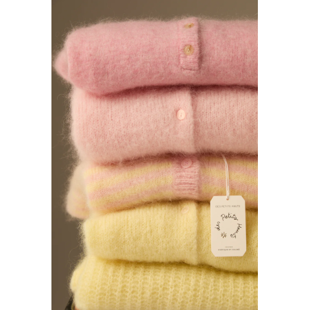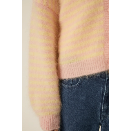 Gilet oversize en kid mohair et laine mérinos beurre / bulle, rayures douces et allure enveloppante.