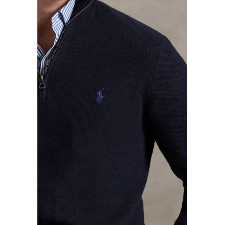 Pull léger demi-zippé en coton piqué bleu marine chiné, coupe Classic Fit, col cheminée côtelé et poney Ralph Lauren brodé sur la poitrine.