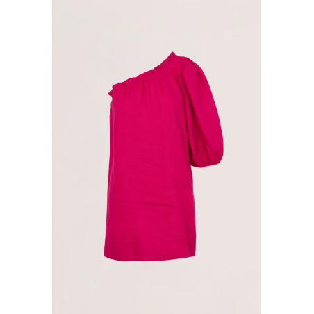 Robe courte asymétrique en lin rose fuchsia, épaule dénudée et manche ballon pour une silhouette estivale audacieuse.