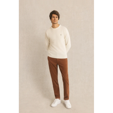 Pull en laine mérinos crème, doux et léger, coupe regular et détails côtelés pour un style raffiné et confortable.