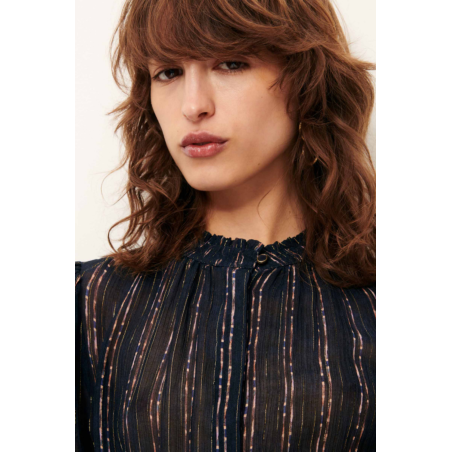 La robe Galy Plumilux de Sessùn séduit par son tombé fluide et son jeu de fronces sur le devant qui soulignent la silhouette. Confectionnée en mousseline de soie et viscose LENZING™ ECOVERO™, elle se distingue par son imprimé exclusif à fines rayures métallisées, pour un style raffiné et lumineux.